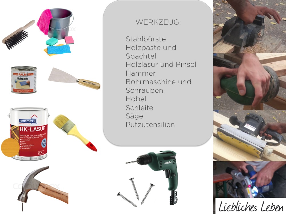 Für Upcycling- Möbel benötigt man neben gebrauchten Paletten verschiedene Werkzeuge, um eine hochwertige Garnitur bauen zu können.