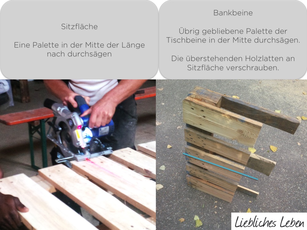 Für die beiden Sitzflächen wird die Palette in der Mitte der Länge nach durchgesägt. Für die Beine der Bänke werden die übrig gebliebene Palette der Tischbeine in der Mitte durchtrennt. Die überstehenden Holzlatten werden an den Sitzflächen verschraubt.