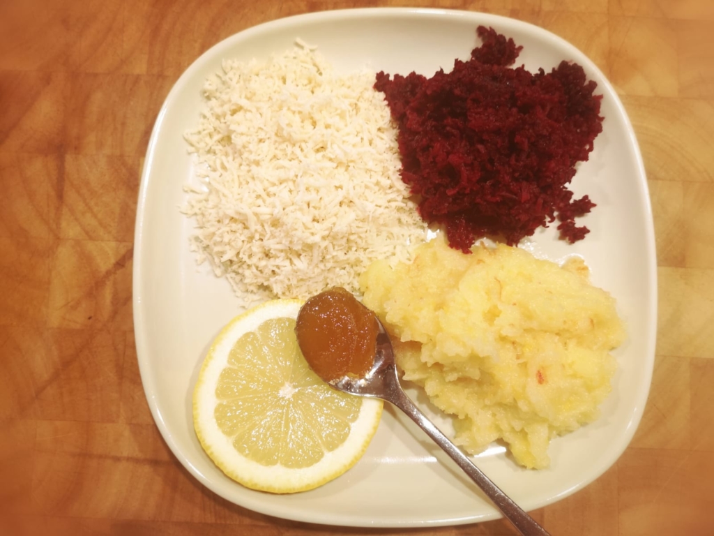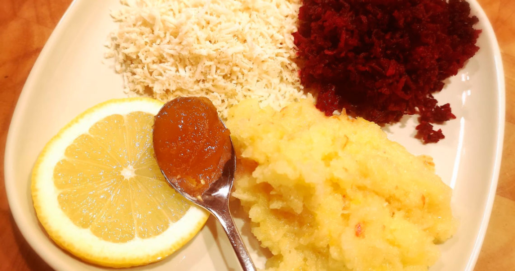 Meerrettich und Rote Beete schälen. Diese beiden zusammen mit dem Apfel im gleichen Verhältnis raspeln.