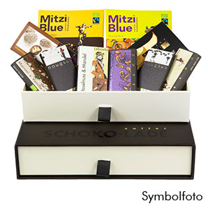 Verschenken Sie schokoladigen Genuss aus Fairem Handel – Schokoladiger Genuss ist mit diesem Geschenkset garantiert. Leckere Zotter Schokoladen sowie eine Trinkschokolade haben den Weg in dieses Präsent gefunden. Natürlich dürfen die typischen Zutaten wie Karamell, Nüsse, Krokant und Nougat nicht fehlen. Allein die handgeschöpfte Tafel „Tausend Blätternougat“ bietet schon fast alles was das Herz begehrt. Auch die Tafel „Nougatvariation“ sorgt für Kaminfeuer-Atmosphäre. Für Liebhaber der intensiveren Schokolade ist die Mitzi Blue Schokolade „Nobelhobel“ und die Labooko „Nicaragua 50%“ mit von der Partie – laut Schokoladentester Bernardini die beste Milchschokolade der Welt. Knackig gehts weiter mit der süßlichen Mitzi Blue „Knusper-Karamell“ in der leckere Karamell-Crispies stecken. Abschließend sorgt die Zotter Trinkschokolade Nuss-Nougat für ein Schokoladenerlebnis der flüssigen Art. Eine herrliche Abrundung dieses Geschenksets.